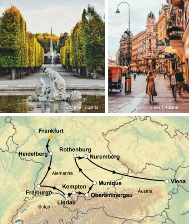 9 dias de viagem passando por Frankfurt, Heidelberg, Friburgo, Lindau, Kempten, Neuschwanstein, Oberammergau, Linderhof, Abadia de Ettal, Munique, Rothenburg ob der Tauber, Nuremberg, Viena
